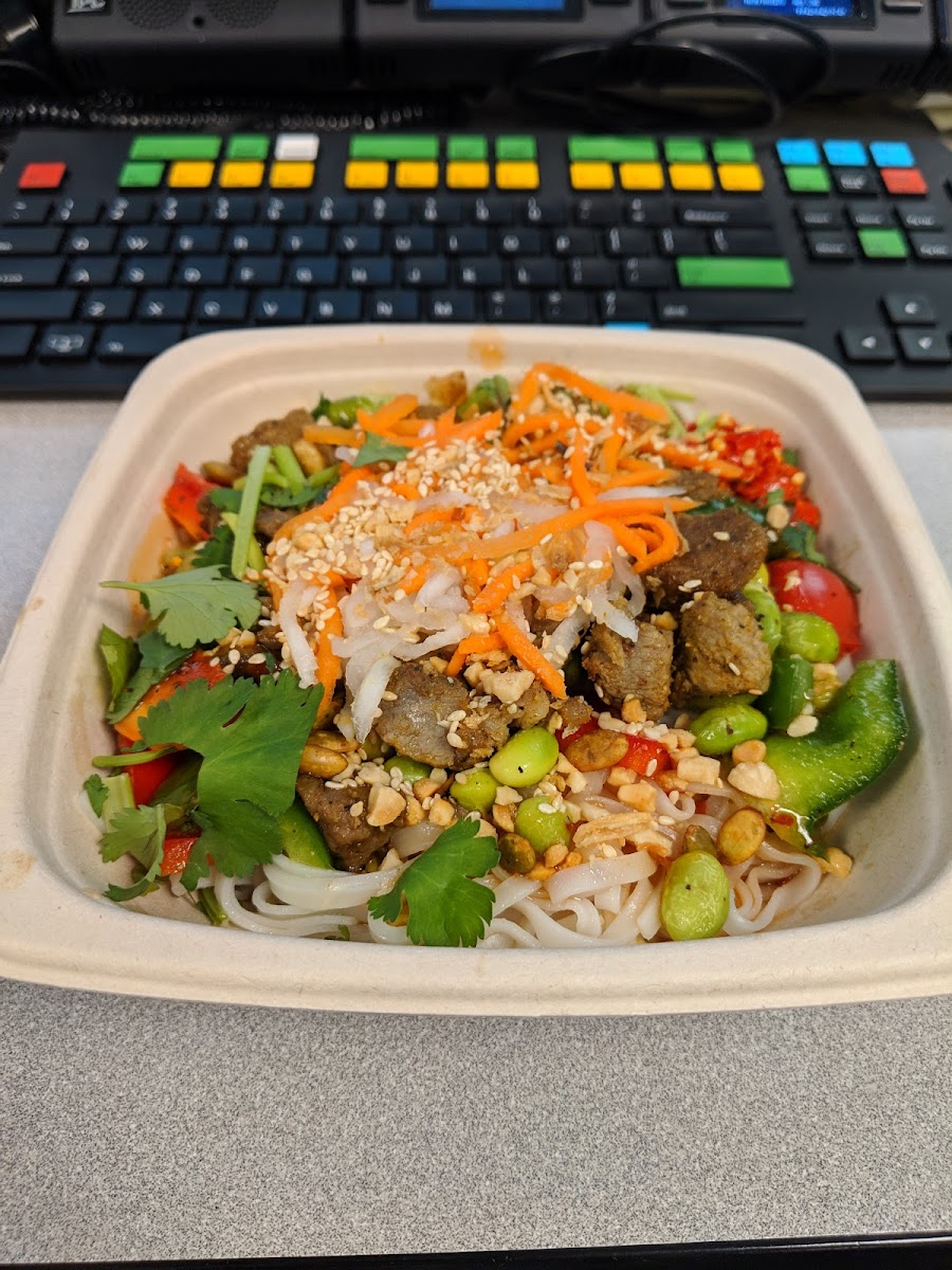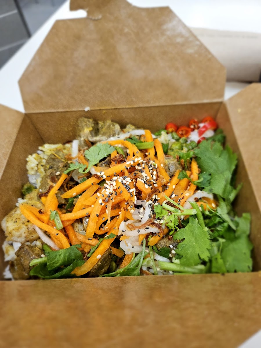 The menu leans into customizable box-style meals that let fresh ingredients shine. One standout is the Hearty Steak Box, which brings together rich, satisfying flavors without feeling heavy. The steak pairs smoothly with uncooked noodles, offering a chewy texture that balances well with crisp vegetables like peppers and edamame. Carrot pickles add a bright, tangy kick that cuts through the savory notes, making each bite feel layered and intentional. For those who prefer poultry, the Lemongrass Chicken Box delivers a fragrant, citrusy aroma that feels comforting and energizing at the same time.